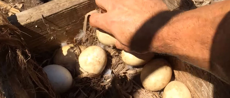 First, you have to actually remove the eggs from the nest without alerting momma Louisiana goose. A mother is gone enough from her nest to make this possible, but it has to be timed just right – after all, you have to have the eggs back in the nest before she returns.